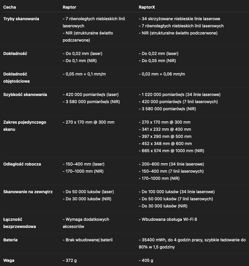 Jeśli szukasz kompaktowego, precyzyjnego skanera 3D do zastosowań stacjonarnych — CR-Scan Raptor będzie optymalnym wyborem. Dla bardziej wymagających użytkowników, potrzebujących mobilności, większej szybkości i lepszego zasięgu — warto rozważyć inwestycję w CR-Scan RaptorX.
