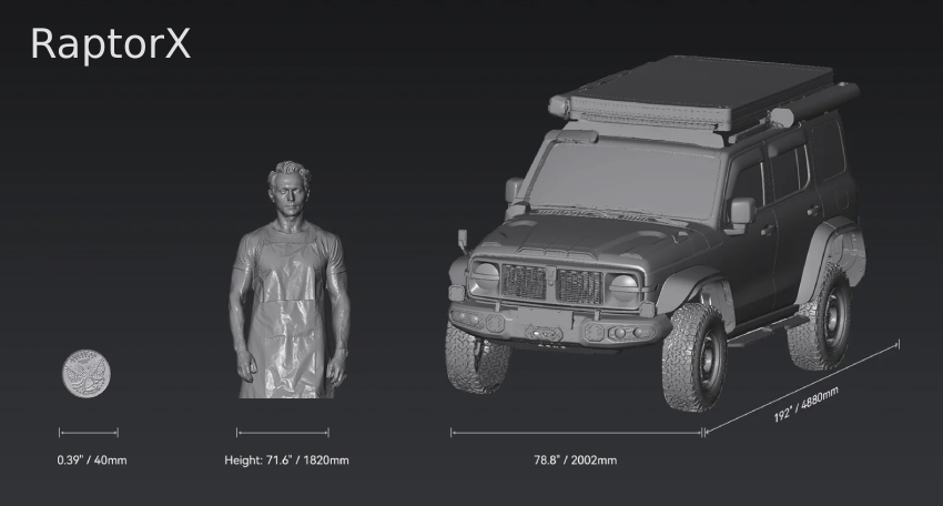 RaptorX oferuje ponad dwukrotnie większy zakres skanowania (do 4000 mm w każdym wymiarze), a także wbudowaną baterię o pojemności 35 400 mWh. Pozwala to na nawet 4 godziny bezprzewodowej pracy w terenie, bez konieczności podłączania urządzenia do komputera. Wbudowany moduł Wi-Fi 6 umożliwia szybkie przesyłanie danych nawet w trudnych warunkach.